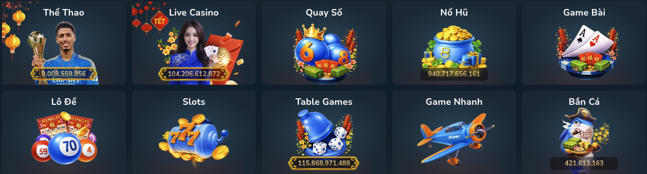 Hiện nay, chúng tôi đang cung cấp 9 chuyên mục cá cược với hơn 3000 sản phẩm khác nhau. Bất kỳ chuyên mục nào cũng hợp tác đa dạng nhà phát hành và đầu tư giao diện, tính năng hiện đại.
